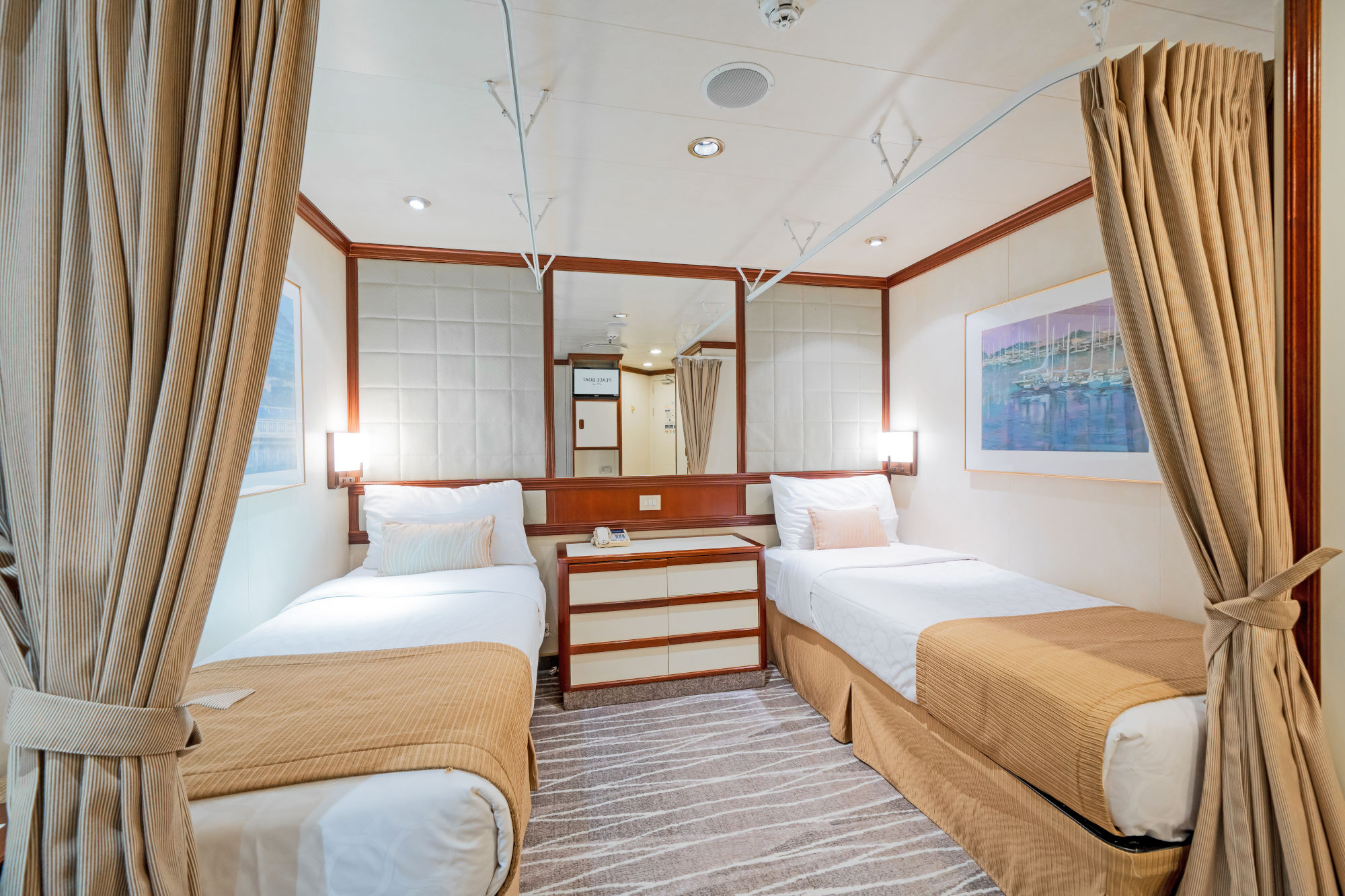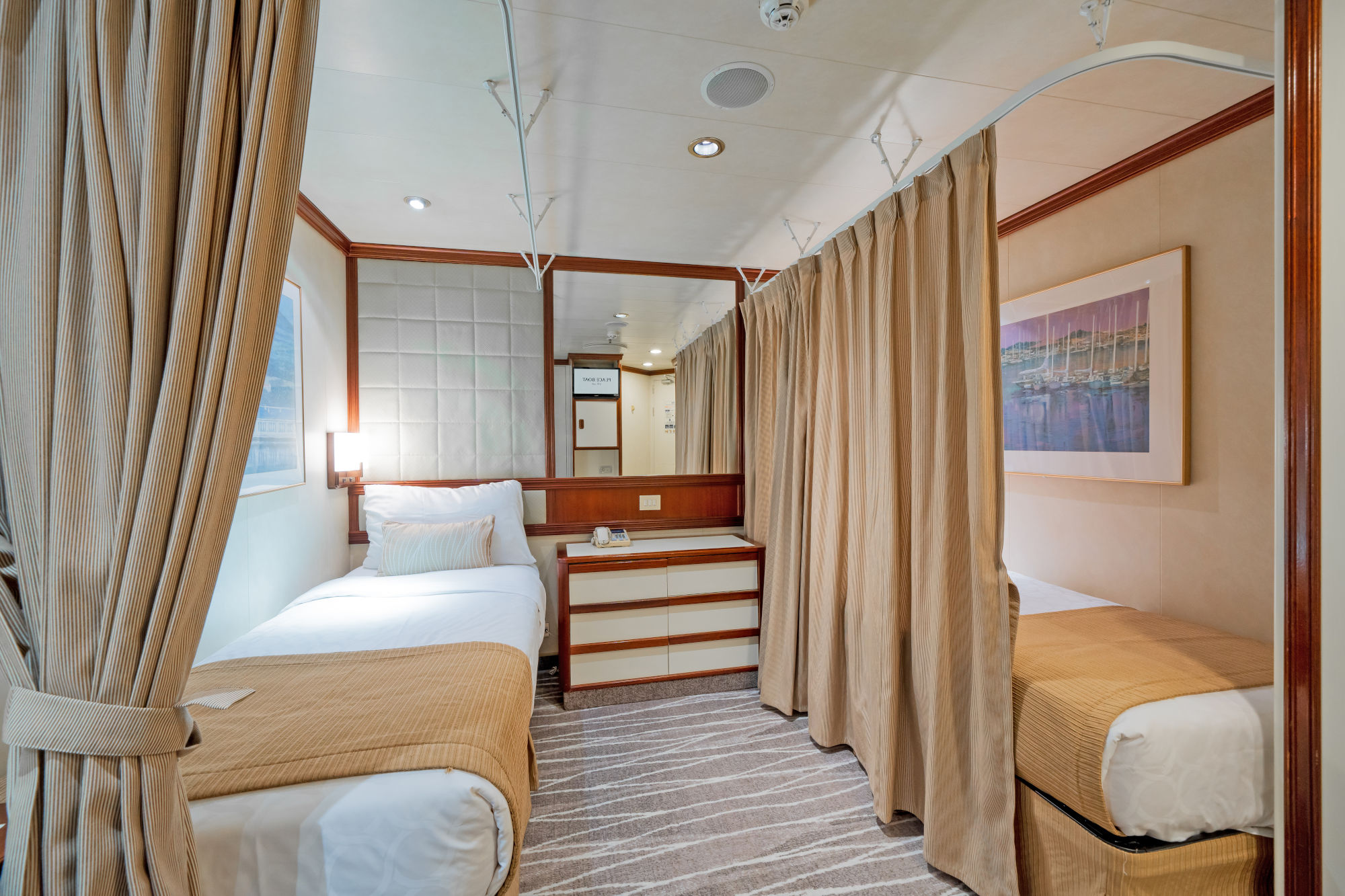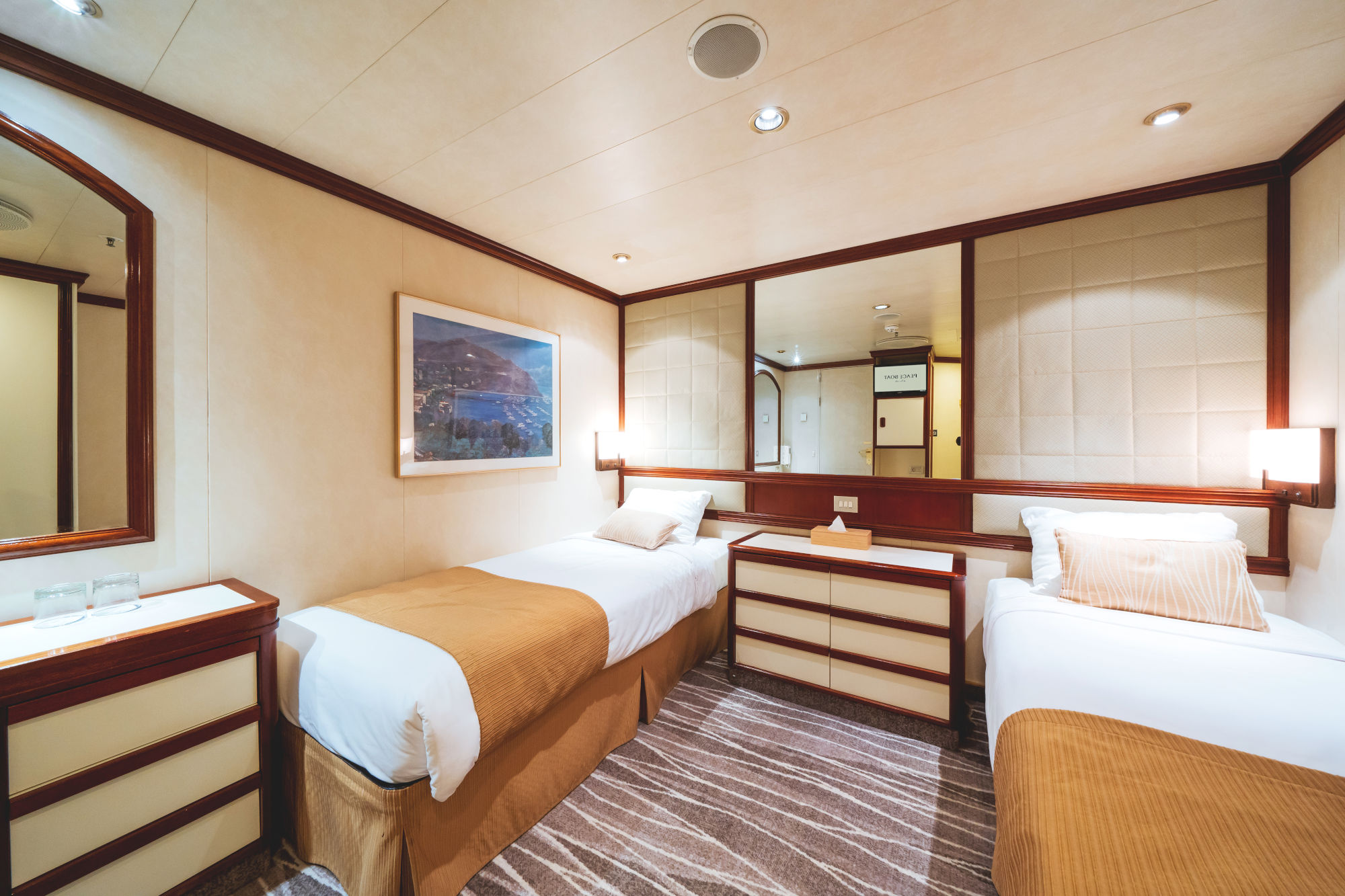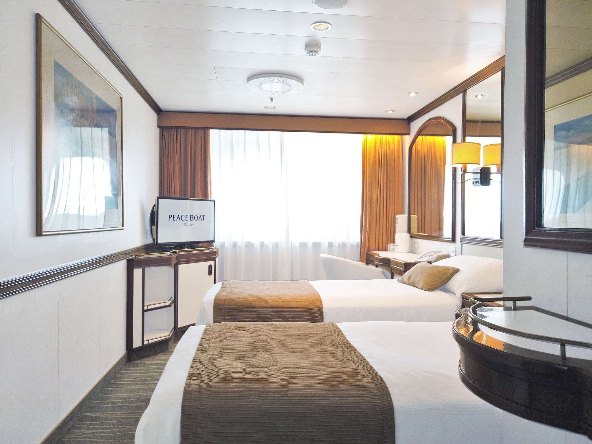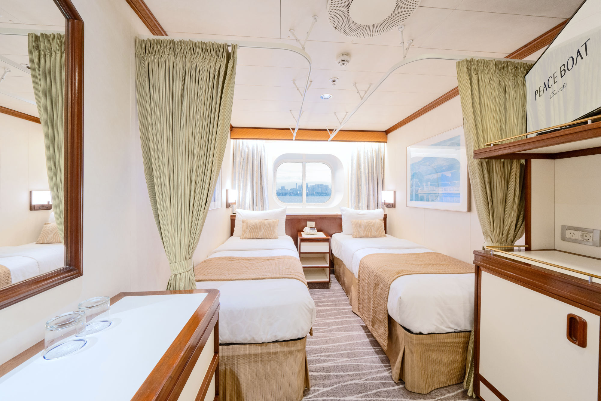 お一人で参加される方でマッチングし、ペアタイプの船室をシェアしてご利用いただけます。バルコニー付きや大きな窓が付いた船室など、旅のプランに合わせてお選びください。