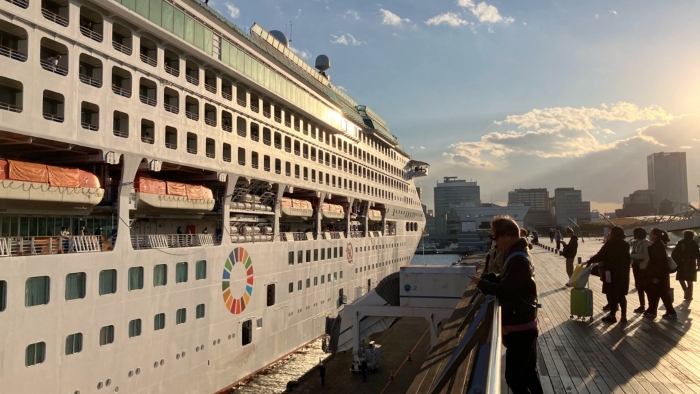 パシフィック・ワールド号は横浜港に帰港しました。少しずつ近づいてくる横浜の街並みを見ると、旅を終えて日本に帰ってきたことをひしと感じます。船のデッキでは、最後のひとときを楽しむようにお友だち同士で写真を撮る方や、お迎えに来たご家族とうれしそうに連絡を取り合う方の姿も。横浜で下船される方たちは、「元気でね!」とお互いに何度も声を掛け合いながら、約3か月を過ごした思い出の船をゆっくりと降りていきました。