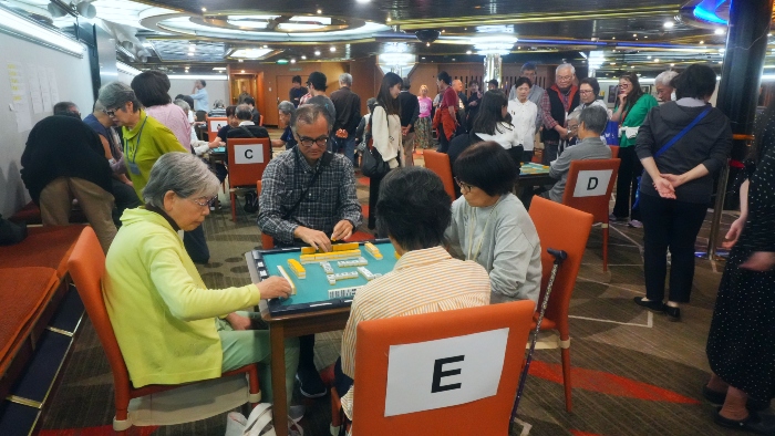 麻雀大会が開催されました。船内のゲームエリアでも大人気の麻雀。ベテランプレイヤーから、この旅の間に麻雀を始めたという方まで、たくさんの方が参加し雀卓を囲みました。応援の方も大勢集まり、興味津々で勝負の行方を見守ります。勝敗が決まると「おぉ!」というどよめきも起こり、会場は盛り上がりを見せていました。