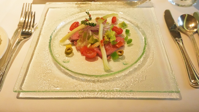 寄港地での食体験はもちろん、船内での日々の食事も「毎日の楽しみ」として挙げる方も大勢いらっしゃいます。2つあるレストランのうち、今日はメインダイニングでコース料理をいただきました。前菜、スープ、メインプレートにデザートと、数種類の中から好きな組み合わせで選べるのもうれしいポイント。今日一日を振り返りながら、美味しい食事をゆっくりと味わいました。