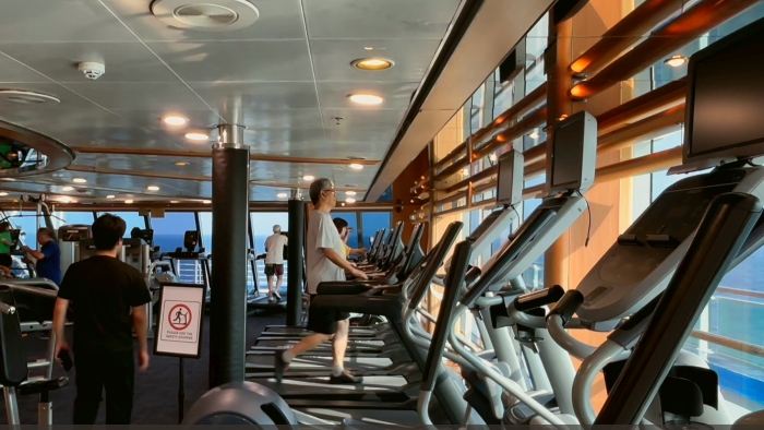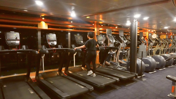 船内にあるフィットネスセンター(スポーツジム)は、旅をしながら健康を維持したり、日々のトレーニングを続けたい方に人気のスポットです。利用は無料で、数多くのマシーンが揃うとあって、幅広い世代の方に活用されています。目線の先にはどこまでも続く海――開放的な空間で体を動かし、リフレッシュが叶う場所です。