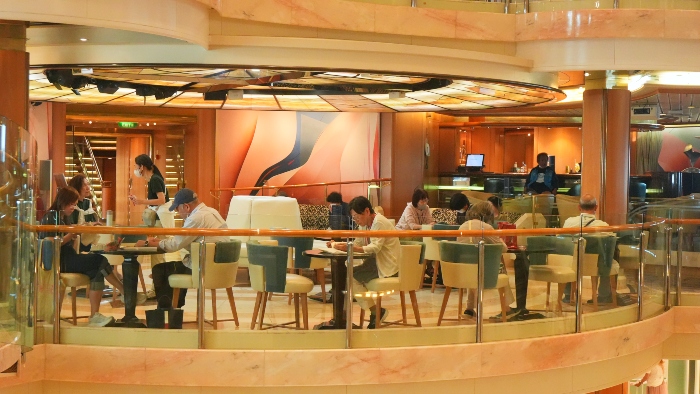 船の中央には、4層吹き抜けの開放的なアトリウムがあります。各階にはバーやカフェはもちろん、たくさんのデスクやソファが配されており、待ち合わせ場所としても人気のスポット。静かに書き物をしたり、ご友人同士でリラックスして過ごすなど、皆さんくつろぎの時間を楽しまれているようです。