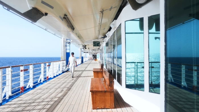 船の7階部分には船体をぐるりと一周できるデッキがあり、ウォーキングを楽しむ人の姿も見られます。日光を浴びながら自分のペースで歩くだけで、心も体もリフレッシュ。定期的な運動習慣は健やかな旅の一歩となり、隣り合う海の景色と波音が、心地よいリラクゼーションをもたらしてくれます。