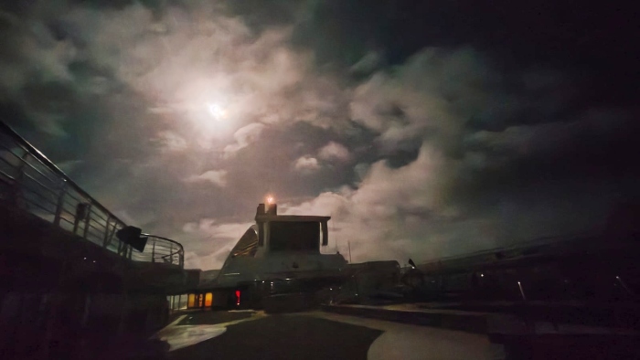 大西洋を北上中のパシフィック・ワールド号は、次の目的地であるアイスランドのレイキャビクへと向かっています。この日、船の上には、雲間から明るく輝く月が顔をのぞかせ、幻想的な光景が広がっていました。オーロラベルト圏の航海がはじまり、これから出会うであろう神秘的なオーロラへの期待が高まります。