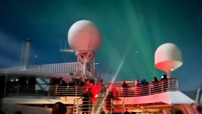 オーロラベルト圏内を航行中のパシフィック・ワールド号の船上で、待ちに待ったオーロラを観測しました。船の前方から後方へと光をのばしてゆく緑のオーロラ――写真や映像ではなく自分の目で眺めるオーロラは、とても神秘的で感動的でした。船のデッキには大勢の人が集まり、夜空で舞い踊る光のヴェール・オーロラを目に焼きつけていました。