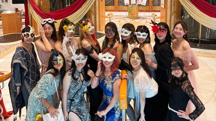 船旅らしいイベントのひとつであり、航海中は何度か行われるクルージングパーティー。この日はマスカレードパーティーが開催され、思い思いの衣装を身にまとい、きらびやかな仮面をつけた方たちが優雅なひとときを楽しまれていました。ファッションショーやダンスパーティーも行われ、船内は華やかなムードに包まれました。