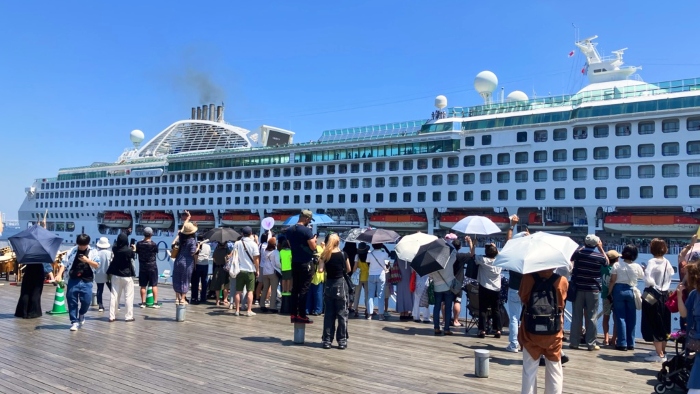Voyage121が横浜港より出航しました。乗客の皆さんは、ご家族やご友人に見送られる中、ワクワクした気持ちを抱えて船へと向かいました。これからはじまる旅では、どんな素晴らしい出会いや体験が待っているのでしょうか――たくさんの「いってらっしゃい!」の声に見送られ、船は神戸港へと向かいます。