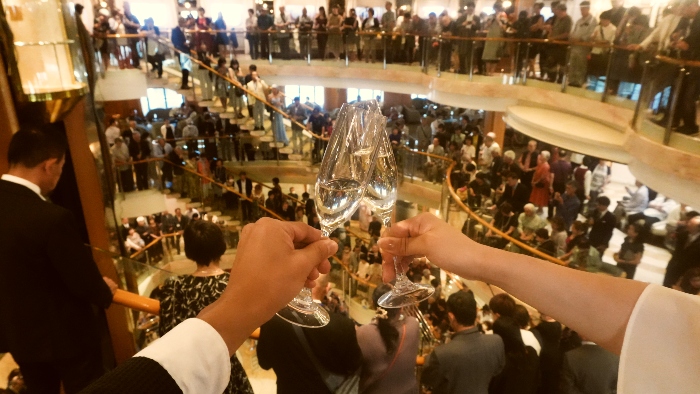 皆さまのご乗船を歓迎する、船長主催のウェルカムセレモニーが開催されました。船長のスピーチやクルーの紹介のあとは、ウェルカムドリンクで乾杯!会場となったアトリウムには、思い思いの華やかな装いに身を包んだ方々が大勢集まり、旅のはじまりを祝う素敵な時間となりました。