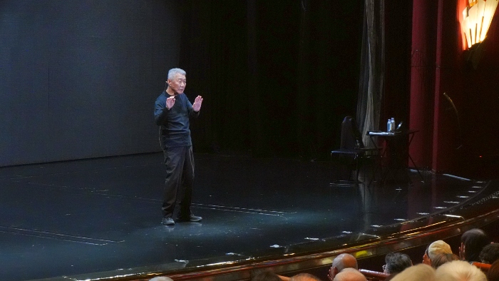 広い舞台でたった一人、言葉を使わず、身体ひとつで表現するパントマイムを披露してくださったのは、水先案内人でスタンダップコメディアンの松元ヒロさん。最初に丁寧な前説で物語をナビゲートしてくださるなど、はじめての人にも親しみやすく、観ている人たちも一緒になって動作を真似るシーンも。言葉の壁を越えて、心に響くパフォーマンスを見せてくださいました。
