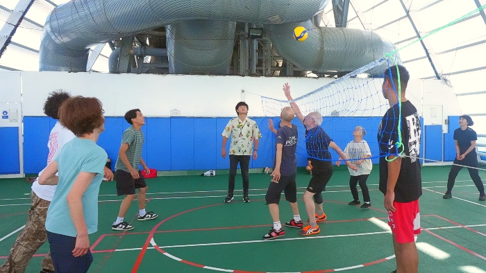 船の最上階には、さまざまなスポーツが楽しめるスポーツコートが設けられています。開放感があり、心地よい海風が吹く人気のエリアとあって、バレーボールやバスケットボール、サッカーなどを楽しむ人たちでいつもにぎわっています。