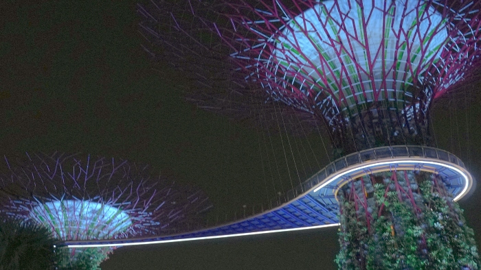 夜のシンガポールでは、昼間とはまた趣きのちがう光景が見られます。自然、テクノロジー、環境マネジメントの共存をコンセプトにした「ガーデンズ・バイ・ザ・ベイ」では、最大で高さ50mもあるスーパーツリーと呼ばれる人工樹木が美しくライトアップされています。SF的な建築デザインと、サステナブルなシステムが生み出す幻想的な夜景を、じっくりと堪能しました。