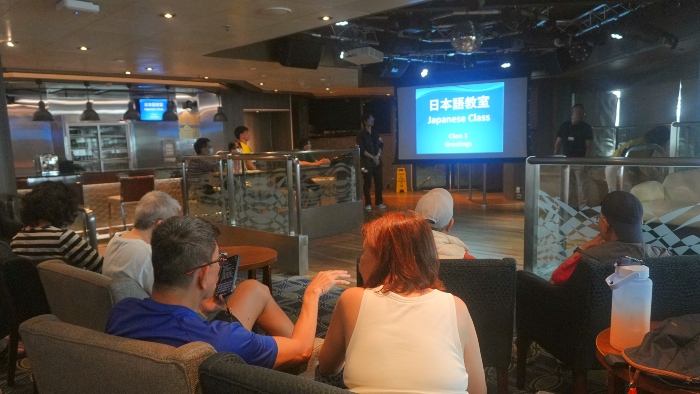 さまざまな国や地域の方が乗船されるピースボートクルーズでは、日本語を母語としない方に向けた日本語教室が定期的に開催されています。あいさつや自己紹介など、船内ですぐに使える日常会話が学べるとあって、参加された方は熱心にメモを取ったり、覚えたフレーズで会話をする姿も見られました。