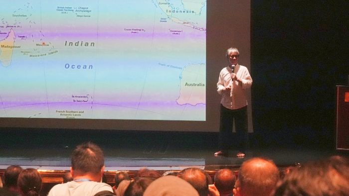 インド洋の島国モーリシャス出身で、文化活動家として知られる水先案内人のパーシー・ヤップ・トンさん。この日の講座では、植民地支配の歴史から生まれた多様な民族、言語、宗教などが紡いだ「クレオール文化」の魅力をご紹介いただきました。間もなく寄港するモーリシャスへの関心がさらに高まる、有意義な時間となりました。