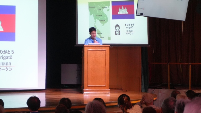 NGOピースボートでは、カンボジアなどの地雷埋没国で地雷除去を実施している政府機関やNGOを支援する「地雷廃絶キャンペーン(P-MAC)」に取り組んでいます。今クルーズでは、深圳で一時下船後カンボジアへと向かい、地雷被害者の自立を支援する団体や、プロジェクトの支援により地雷が除去された村を訪問する4日間のオプショナルツアーが実施されました。この日の報告会では、参加者それぞれが現地で学び、感じたことを発表し、会場に集まった方々に体験を共有してもらう貴重な場となりました。