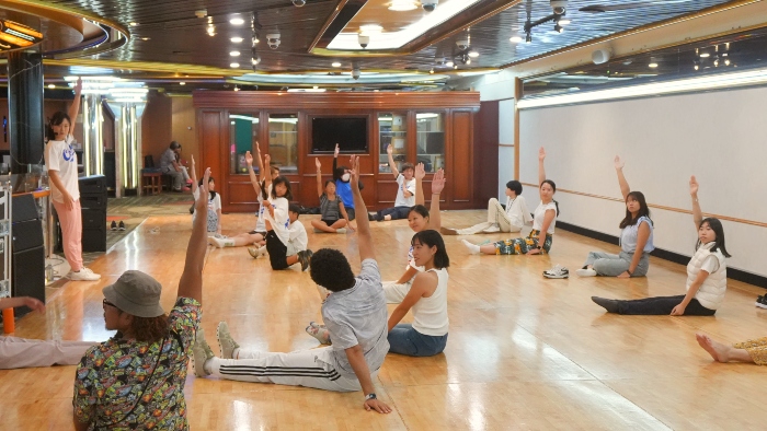 幅広い世代を対象としたチアダンス&チアリーディングの指導を行ってきた、水先案内人の磯崎由佳さんのワークショップが開催されました。腕や足の伸ばし方などチアの基本がしっかりと学べる内容で、ダンス経験者はもちろん、チアを全力で楽しみたい方が多数参加しました。今後はちょっぴりチャレンジングな振り付けにも挑戦するそうで、船内イベントでのお披露目が楽しみです。