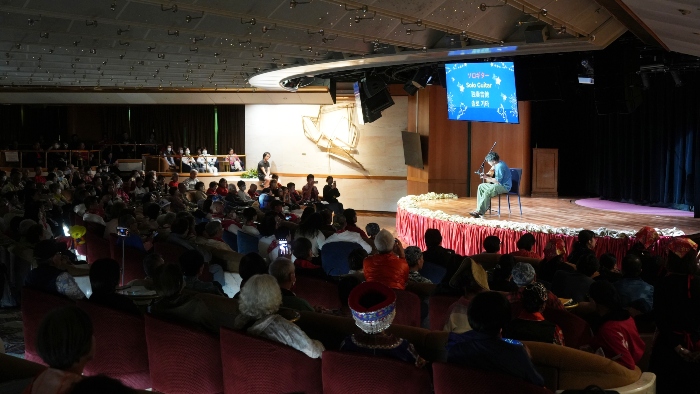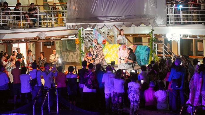 これまで船内で演奏会やワークショップなどを多数開催してくださった、水先案内人のマハーニ・テアーウェさん。そんなマハーニさんの故郷であるイースター島寄港中の船内で、彼女が設立したイースター島初の音楽学校「トキ・ラパ・ヌイ」の生徒の皆さんがライブを開催してくださいました。たくさんの方々が集まったアトリウムに響き渡る、美しい歌声と楽器のハーモニー。島民の皆さんの誇りやアイデンティティが感じられる、素晴らしいパフォーマンスを見ることができました。