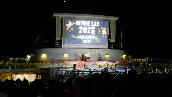来たるべき2026年を、世界一周という旅の最中に迎える特別な瞬間――大勢の方々が集まった船のデッキではカウントダウンパーティーが開催されました。巨大スクリーンで数字がカウントされ2026年を迎えると、「あけましておめでとう!」「HAPPY NEW YEAR!」といった声があちこちから上がります。一生の記憶となるような特別な瞬間を共有し、新しい年の幕開けをみんなでお祝いしました。