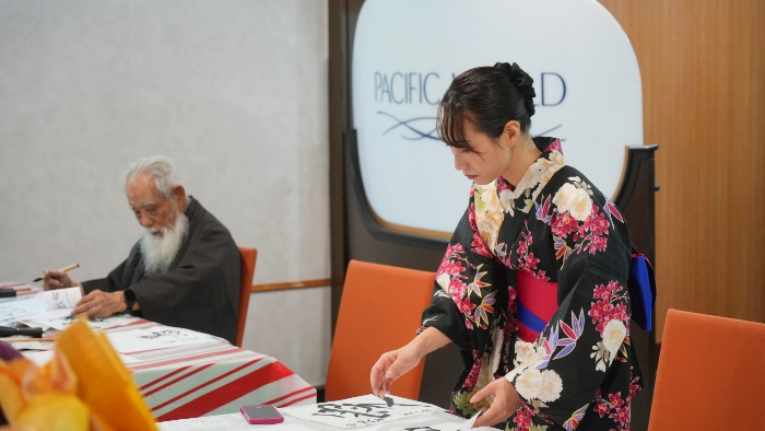 華やかで美しい祝い飾りが施された船内では、お正月ならでは体験を楽しむ方たちの姿も見られました。書き初めに新年の抱負を力強く書く方、福笑いやけん玉など昔ながらの伝統的な遊びを楽しむ方も。またお茶席も設けられ、お抹茶とお菓子を味わいながらゆったりとお正月気分を堪能される方もいらっしゃいました。