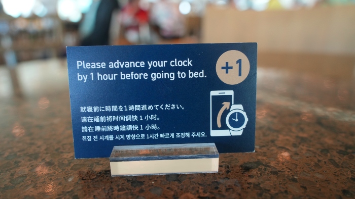 船旅では次の寄港地での時間に合わせるため、1時間単位の時差調整を行っていきます。飛行機の旅とは違い、少しずつ調整を行うため時差ボケがなく、旅の日々を快適に過ごせます。時差調整のある日は、船内新聞はもちろん、レストランなどの公共施設にも時差調整を知らせるボードが掲示されるので安心。今回は東回り航路のため、就寝前や24時を迎えたタイミングで、身の回りの時計を1時間進めれば完了です。