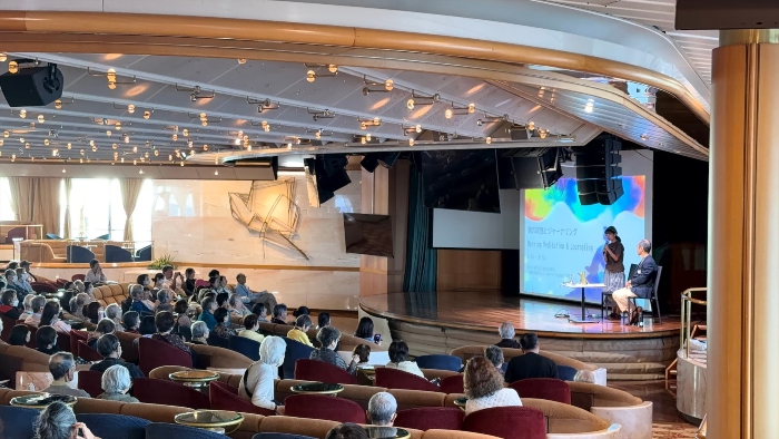 元共同通信の記者であり、日本人記者としては最も長くラテンアメリカに携わるなど世界各地を取材されているジャーナリストの伊高浩昭さんの講座が開催されました。この日は、まもなく寄港するラパヌイ(イースター島)のモアイ像にまつわる謎の解明に挑んだ人類学者ヘイエルダールの記録をもとに、ポリネシア文化圏に位置するラパヌイと南米文明のつながりなどをお話しいただきました。地理的にも隔絶されたラパヌイが、他の大陸や島々と多くの共通点を有することを知り、太平洋という海を舞台に育まれた歴史や文化に思いを馳せる時間となりました。