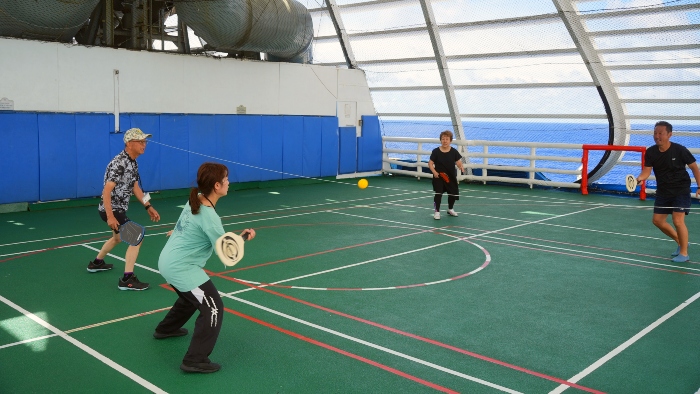 船の最上階にあるスポーツコートで、何やらラケットのようなものでボールを打ち合う人たちの姿が――これは「ピックルボール」という、テニスとバドミントンと卓球の要素を併せ持つスポーツなんだそう。穴の開いたボールを使用するのでスピードも緩やかでラリーも続けやすく、この日もさまざまな年代の人たちが楽しむ様子が見られました。
