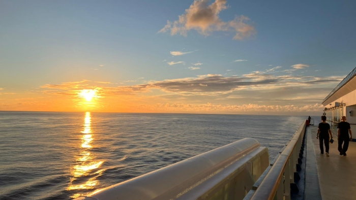 今回のVoyage122では、本船が12月31日の早朝に日付変更線を西から東へと超えた瞬間に、一時的に「1月1日」になるというめずしい現象が発生しました。そうなると“世界で最も早い初日の出”となるため、大勢の方がデッキで世界一早い初日の出を楽しまれました。地球の自転、そして日付変更線をまたいで航行するこの旅ならではの、スペシャルで不思議な体験となりました。
