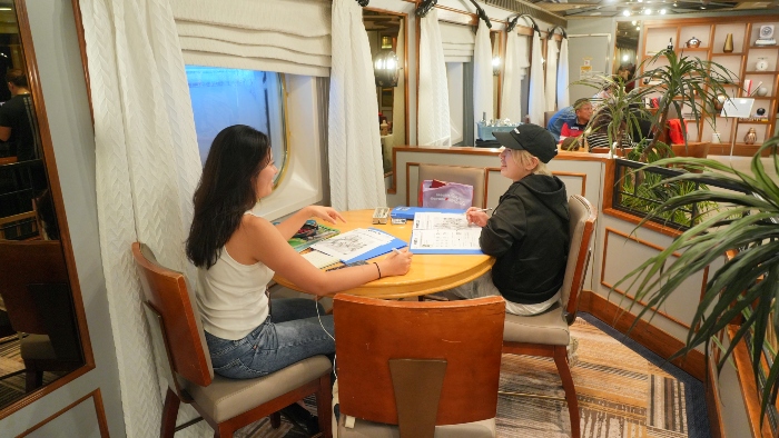 テーブルや椅子、ゆったりと座れるソファなどが各所に配された船内の公共スペース。ご友人と英会話の勉強に取り組む方、パソコンを広げてお仕事をされる方、静かに読書を楽しまれる方――皆さんそれぞれのひとときを過ごしているようです。旅という非日常をおくりながら、自分のやりたいことに好きなだけ向き合えるのは、ゆったりと時を刻むクルーズ旅行ならではの過ごし方です。