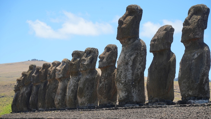 小型ボートでイースター島へと上陸し、ついにモアイ像と対面です。まずは、写真や映像で何度も観てきた、15体のモアイ像が並び立つアフ・トンガリキへ。海を背に、虚空を見つめて佇むモアイ像はとても神秘的。荒涼とした大地が広がる光景も相まって、時間を忘れて眺めてしまいます。他にも、製造途中のモアイが残るラノ・ララクではさまざまな姿のモアイたちを見ることができ、一日かけて憧れのモアイ像との時間を堪能しました。