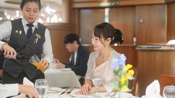 クルージングパーティーが開催される日は、いつもよりドレスアップしてレストランに向かわれる方もいらっしゃいます。本格的なコース料理やバラエティに富んだアラカルトなどを、ご友人やご家族と一緒にゆっくりと味わう、ぜいたくなひとときをお過ごしいただけます。
