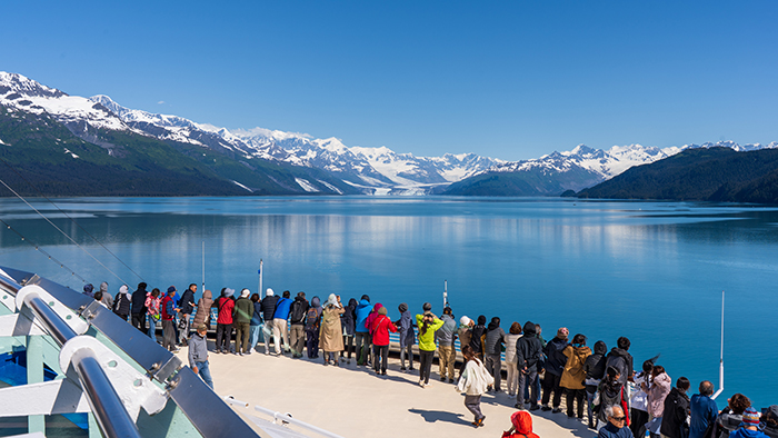 地球の鼓動が聞こえる場所、アラスカへ。木々の生い茂る雄大なフィヨルドやダイナミックな流氷、巨大な氷河が織りなす絶景が待っています。船は、氷河が削り出した壮大なフィヨルドの奥深くまでゆっくりと進みます。一歩デッキに出れば、どこまでも続く垂直の岩壁と海に浮かぶ流氷が広がる圧巻の景色が目の前に現れます。地球の歴史が創り出した圧倒的なスケールの大自然が静かに広がるこの特別な時間は、旅のハイライトのひとつとなるでしょう。