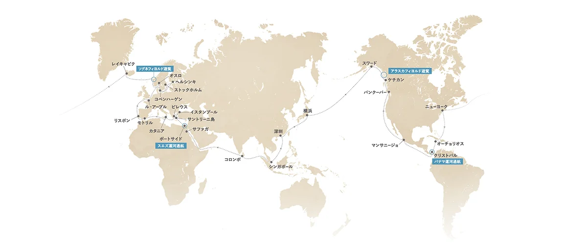 雄大な自然が待つノルウェーフィヨルドと神秘的なブルーのアラスカフィヨルドへ。船旅ならではの絶景が待ち受けます。ポートサイドやサントリーニ島、ル・アーブル、ニューヨーク、ジャマイカ、バンクーバーなど、数々の寄港地をめぐります。