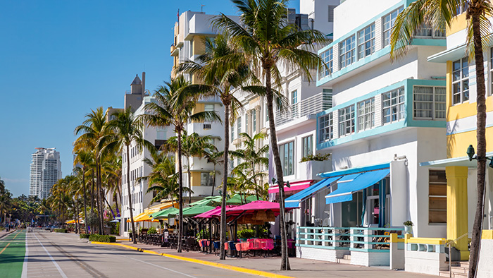 陽光あふれるフロリダ州・マイアミは、船旅の出発地として世界中の旅行者に愛される港町。朝焼けに染まるカリブ海のビーチでは、やわらかな波音と潮風が旅の始まりを告げます。夕暮れから夜にかけては、マイアミのもうひとつの顔が現れます。南ビーチ沿いにはアールデコ様式の建物が並び、レトロなネオンサインが通りを彩ります。まるで映画のワンシーンのような風景は、20世紀初頭から続くこの街の文化の象徴。散策するだけで、まるでタイムトラベルをしているかのような感覚に包まれます。