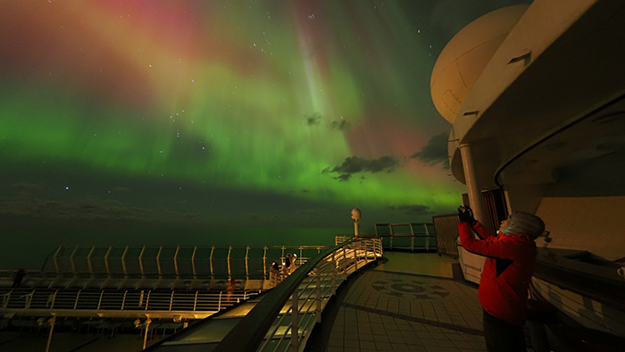 地球上でオーロラが最も頻繁に出現するのは緯度60~70度付近の「オーロラベルト」とよばれるエリア。船はこのオーロラベルト圏内を5日間にわたり、航海します。その際、船にはオーロラハンターや天体観測のスペシャリストが乗船し、オーロラにまつわる神話や発生する仕組み、オーロラ撮影講座など、夜に備えたイベントを開催します。