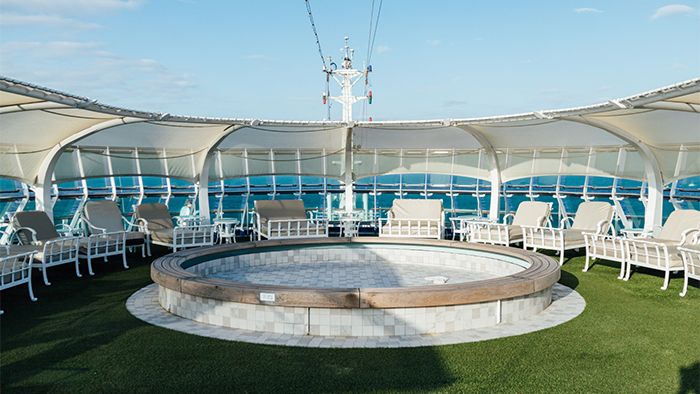 15階にあるのは、"サンクチュアリ"と呼ばれる自由にくつろげるスペース。水場を中心にデッキチェアが置かれ、皆さん思い思いの過ごし方をされています。煌めく太陽の下で海風に当たりながら、のんびりとしたひとときが過ごせる場所です。