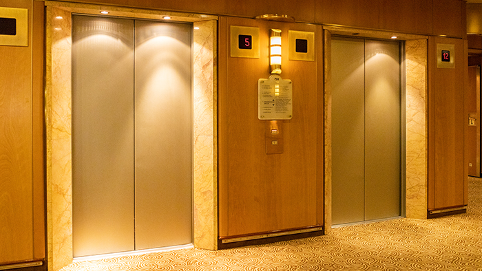 全11フロアを乗客エリアとして使用するパシフィック・ワールド号。船内の上下階との行き来は、エレベーターを使って楽に移動できます。前方、後方、アトリウムとエレベーターの設置場所によって行けるフロアが違いますが、クルーズも2か月が過ぎ、みなさんしっかりと使いこなしています。