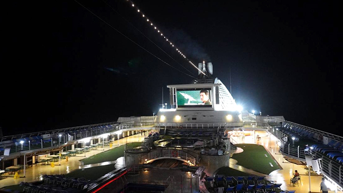 360度見渡すかぎり、明かりがない海の上──。船が進む音と波の音が聞こえてきます。そんな音色を聞きながら、静かに一日を振り返ることができるのも、夜のデッキならではです。