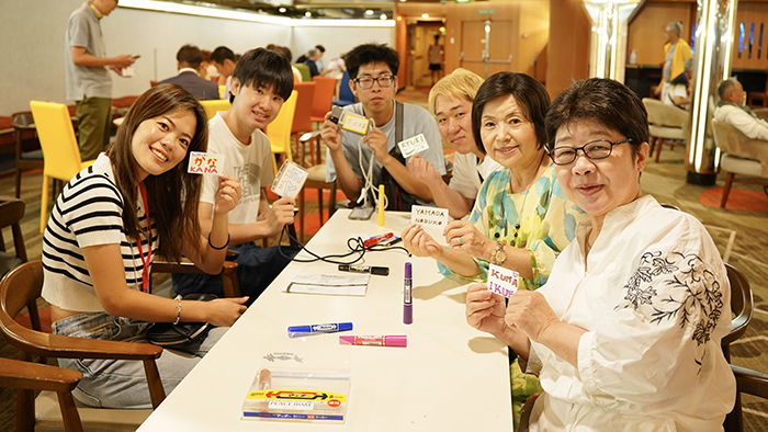 たくさんの方が乗船している船内で便利なもののひとつ、オリジナルの名札を制作する企画が行われました。完成したものを見せてもらうと、かわいらしいイラストが入っていたり、さまざまな言語で名前を書いているものも。テーブルごとに話も弾み、楽しいひとときとなりました。
