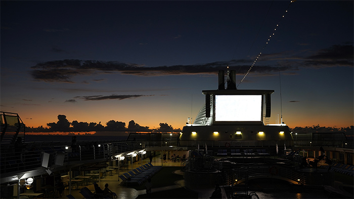 ふと思い立ってデッキへ向かうと、ちょうど海の向こうに日が落ちたところでした。波音をBGMにオレンジ色に染まった水平線を眺めていると、どこからともなく人が集まり、同じように美しい光景に見入っていました。