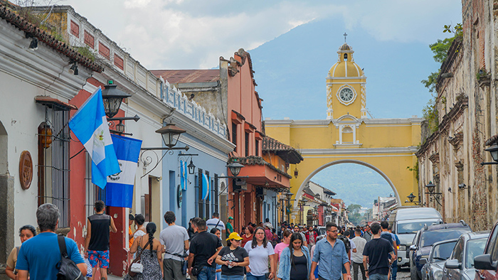 マヤ文明発祥の地として知られるグアテマラ。ここでは、世界遺産の古都アンティグアへ。石畳の道沿いには、カラフルな民芸品が並ぶおみやげ屋さんが軒を連ね、カフェに入れば名産品のコーヒーを楽しむこともできます。