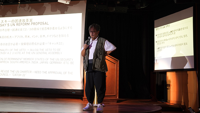 ニューヨーク寄港が間近に迫った船内では、ジャーナリスト、作家として活動する北丸雄二さんによる講座が行われました。長年ニューヨークで暮らした経験を持つ北丸さんに、ニューヨークに本部がある国連の歴史やその役割などについてお話いただきました。