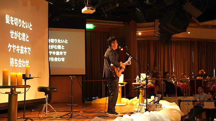 日本ヒップホップ界の先駆者でもあるラッパー、GAKU-MCさんによるライブの幕開けです!「新たなチャレンジ」をテーマに、今年日本各地で弾き語りツアーを開催したGAKU-MCさん。船内にも、素敵な歌声を届けてくれました。