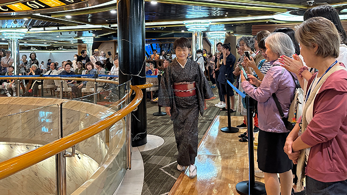 お茶会や書道スペース、日本酒バーなど、日本の文化を体験・紹介する企画が行われました。着物ショーでは、モデルの方が通るたびに大きな拍手がおこりました。さまざまな国や地域の方が乗船しているピースボートクルーズならではの時間となりました。