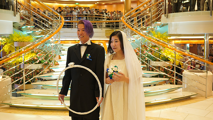 たくさんの方が見守る中、洋上結婚式が行われました。音楽とともに主役のお二人が登場すると、会場から大きな拍手が起こりました。お二人はもちろん、一緒に結婚式を作り上げた旅仲間たちにとっても大切な一日となりました。