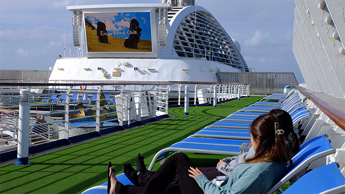どこまでも広がる青い空と海を眺めながら過ごす、贅沢なひととき。デッキには約320インチのLEDスクリーンが設置されているので、時にはゆったりと映画を鑑賞することもできます。