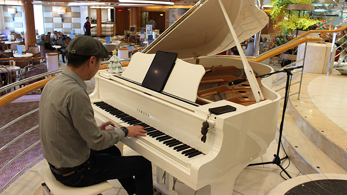 4層吹き抜けのアトリウムに響く、ピアノの音色。専属ピアニストによる生演奏が始まりました。演奏が始まる時間になると、それぞれお気に入りの場所で美しい音色に耳を傾けています。