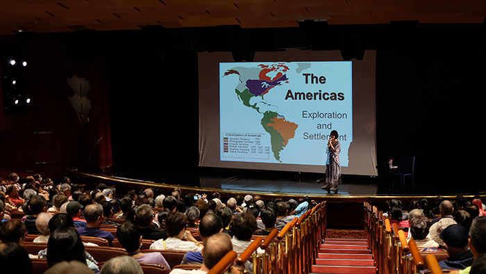 今クルーズで寄港するペルーで人気の世界遺産、マチュピチュ遺跡やインカ文明について、陸秀慧(デジレー・ルー)さんにお話いただきました。実際に訪れた際のエピソードやたくさんの写真を交えての講座に、寄港を楽しみにしている多くの方が熱心に耳を傾けていました。