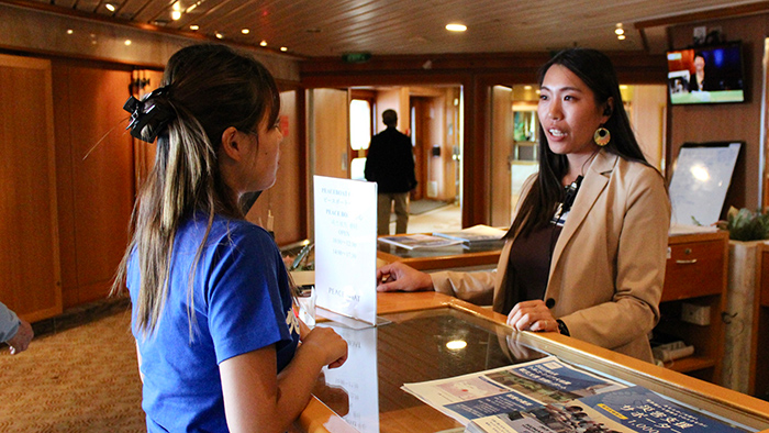 日々の船内生活をより充実したものにする設備のひとつ、ピースボートセンター。ここでは、イベントや自主企画で使用するグッズをはじめ、スポーツ用品の貸し出しなどを行っています。毎日たくさんの方が訪れ、とても賑やかです。