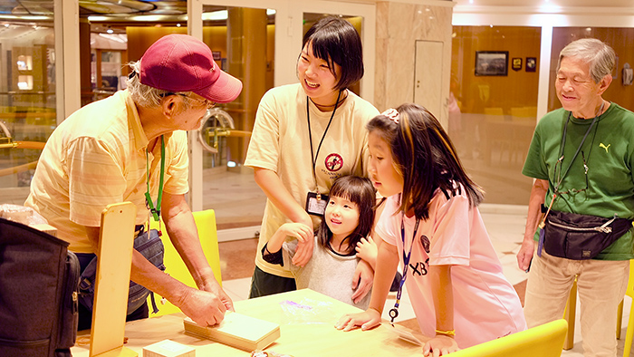 子どもから大人まで楽しめる組木パズルを楽しむ自主企画には、世代を超えていろいろな方が参加しました。使用したパズルは企画者の手作りだそう。「難しいなぁ。」「脳トレにぴったり!」そんな声があがりました。