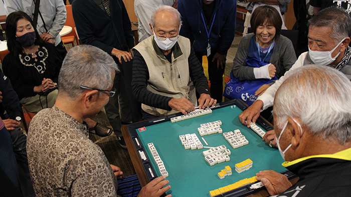 船で麻雀を始めた初心者からベテランの方々まで約90名が参加し、麻雀大会が開催されました。応援にかけつけたみなさんも、すっかり夢中になって試合の成り行きを見守っています。大会が終わると、参加したみなさんに大きな拍手が送られました。
