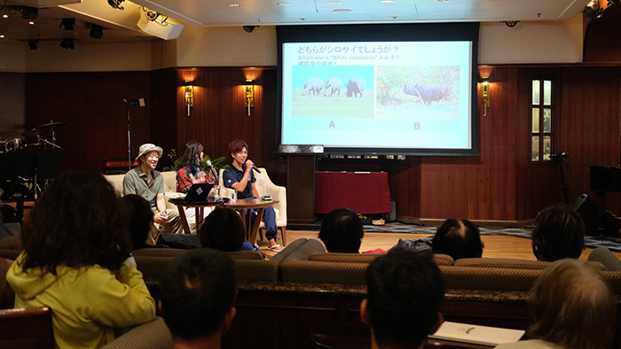 ケニア政府公認サファリガイドの加藤直邦さんが動物園で働いていた経験をもつ乗船者の方を招き、ともに企画を行いました。動物にまつわるアレコレをクイズ形式で出題。旅の指針となってくれる洋上ゲストはとても身近な存在です。楽しみながら学ぶ、にぎやかなひとときとなりました。 旅をより有意義なものへナビゲート [水先案内人紹介]加藤直邦さん